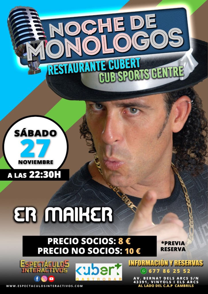 En Cambrils, Cubert Gastrobar, el restaurante del CUB CENTRE ESPORTS, a las 22.30. Actuación cómica der Maiker, fusionando lo infusionable, con un flow a lo michael jackson gipsy las risas estan aseguradas.