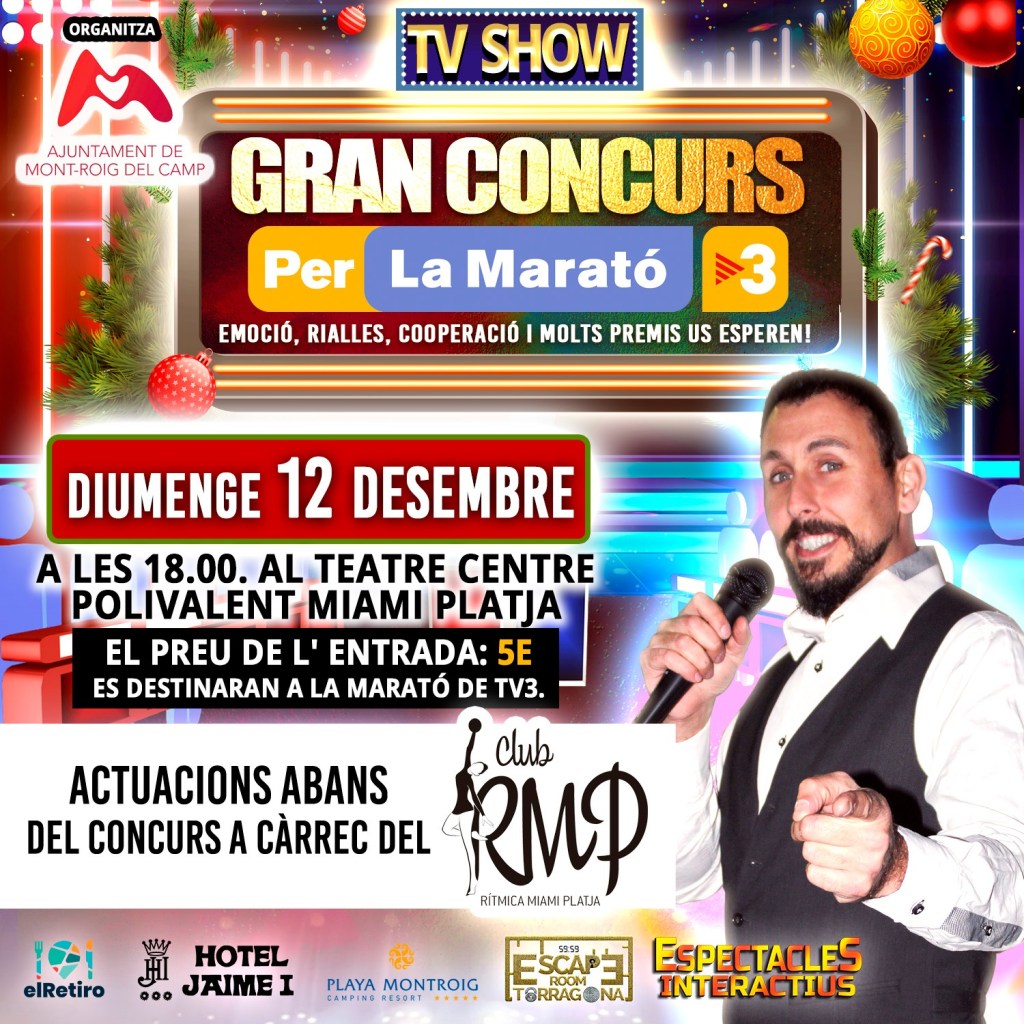 Aquest proper dia 1 a les 18.30 al casal jove K1 de Mont-roig del Camp podreu gaudir de la segona edició del Concurs televisiu per la Marató de Tv3, on riurem competint entre equips i acabarem amb molts regals per part de l’Associació d’empresaris de Mont-roig. Preu de l’entrada 5 euros que aniran destinats a la Marató de Tv3.