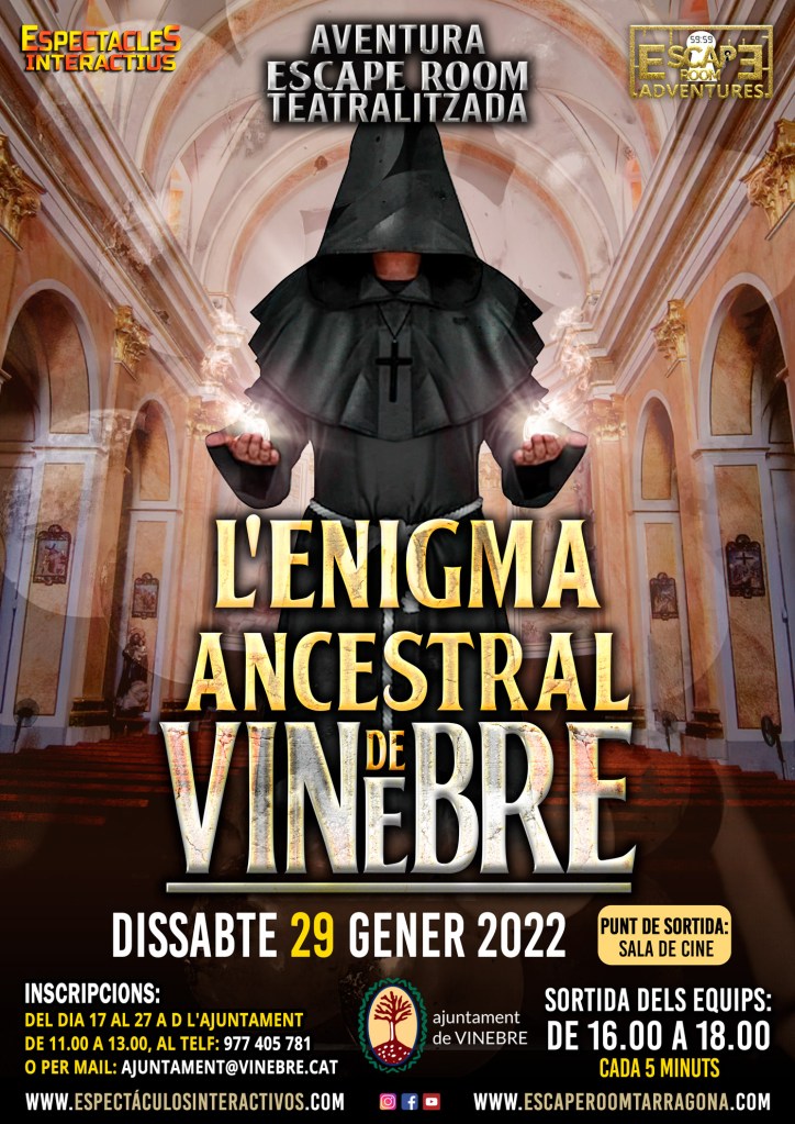 En esta ocasión nos vemos en un pequeño municipio a las orillas del Ebro (Vinebre), donde viviremos una aventura cronológica desde época romana, pasando por el medievo hasta llegar a la época de su esplendor: El modernismo. Descubriremos parte de su interesante historia con personajes reales de su pasado, alguno de ellos bastante importante en la comarca. Una actividad para todas las edades, y adaptada a las medidas anti covid actuales. Información y reservas por mail: info@espectaculosinteractivos.com. Sábado 29 de Enero de 16:00 a 19:00. Vive la historia siendo el protagonista de la trama!